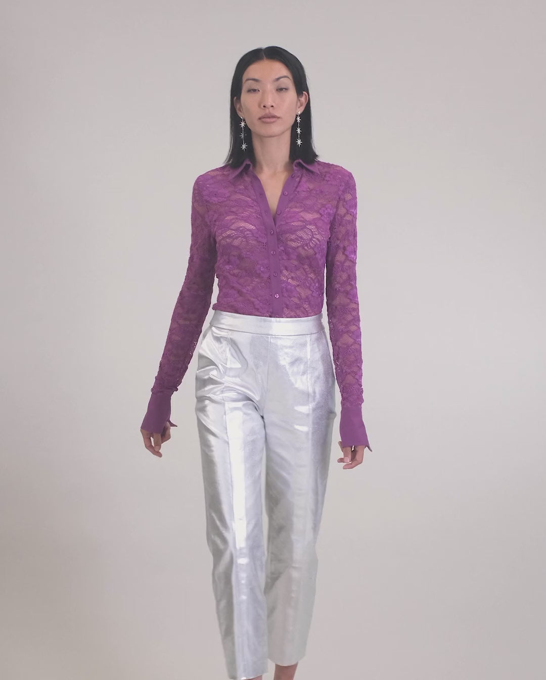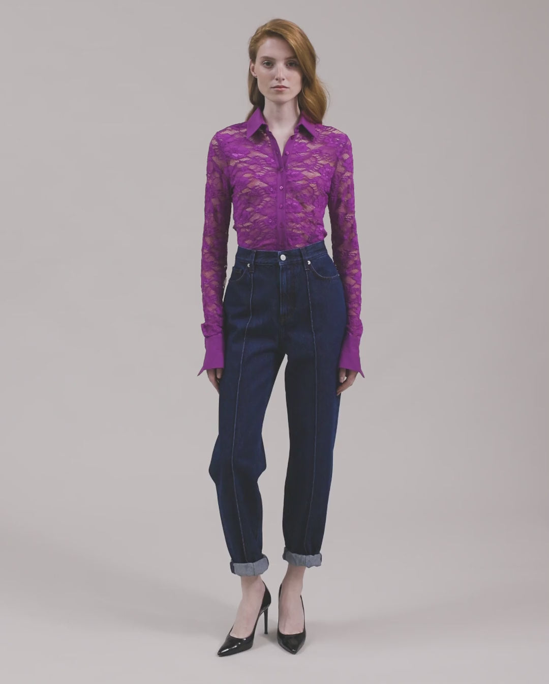an unlined lace shirt enhanced with openwork floral patterns. This fitted silhouette features a center front button placket, pointed collar, and French cuffs in a coordinating Pima jersey fabric.