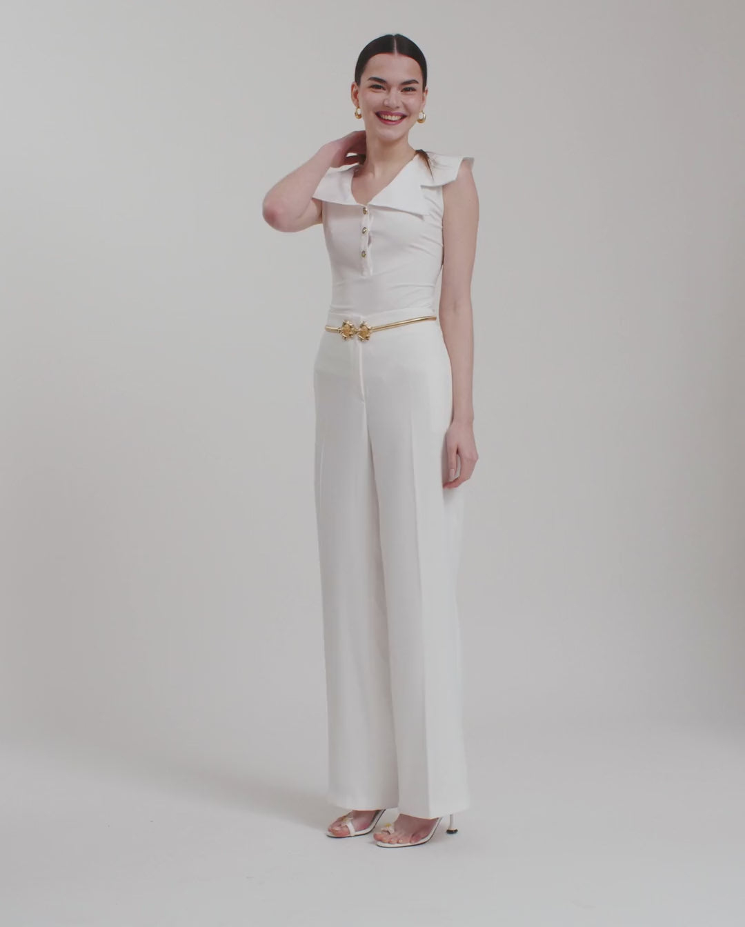 Introducing the ALIZEE white jersey knit sleeveless top - a perfect blend of chic design and elevated detailing. This versatile top features a pique double collar, with one square collar and one pointed collar, adding an unexpected twist to the classic silhouette. The center of the top showcases a pique button placket adorned with three striking nautical blue and gold buttons, adding a touch of sophistication and maritime charm.
